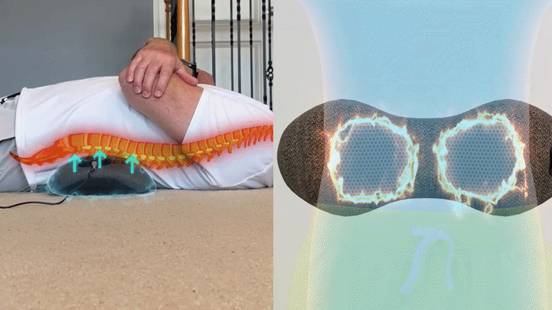 traction douce pour décompresser la colonne, chaleur apaisante pour détendre les muscles et massage ciblé pour relâcher les tensions dans la zone lombaire.