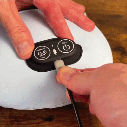Branchez le câble USB. Les boutons de commande s'illuminent, confirmant que l'appareil est prêt. Placez-le sur une surface plane : sol, lit ou canapé